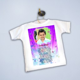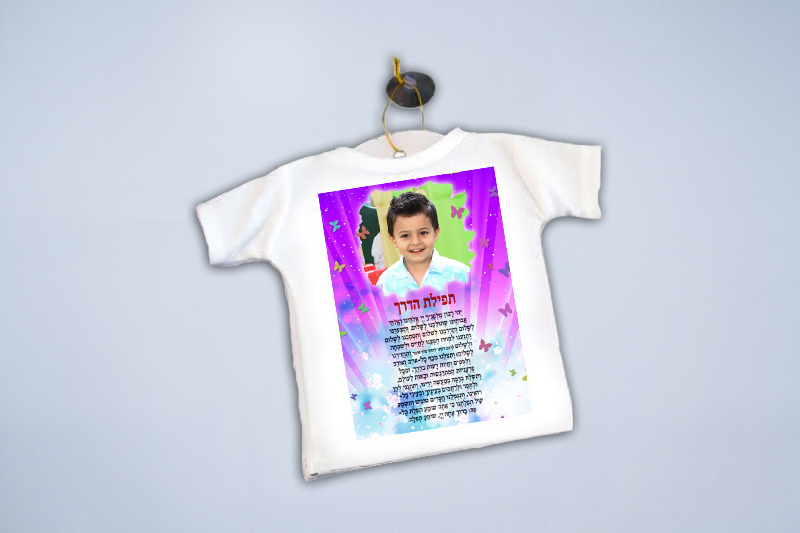 חולצה קטנה לתליה ברכב עם ווקאום. החולצה בצבע לבן מבד פוליאסטר מעוטרת בגרפיקה צבעונית סדר תפילת הדרך ותמונה אישית.