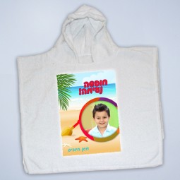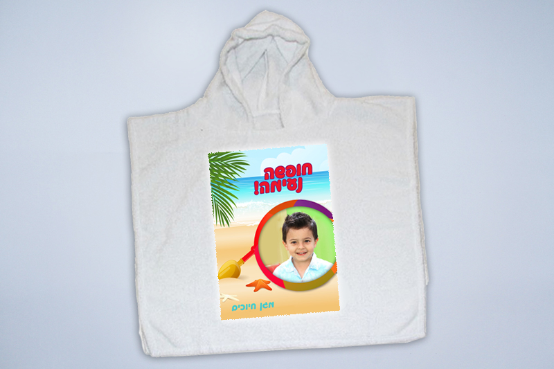 פנצ'ו – מגבת קפוצ'ון לחוף הים, לבריכה או לאמבט מגבת איכותית ונעימה עם הדפסה עמידה וגרפיקהבאוירת קיץ וחוף ים המשלבת הקדשה ותמונה אישית.