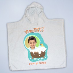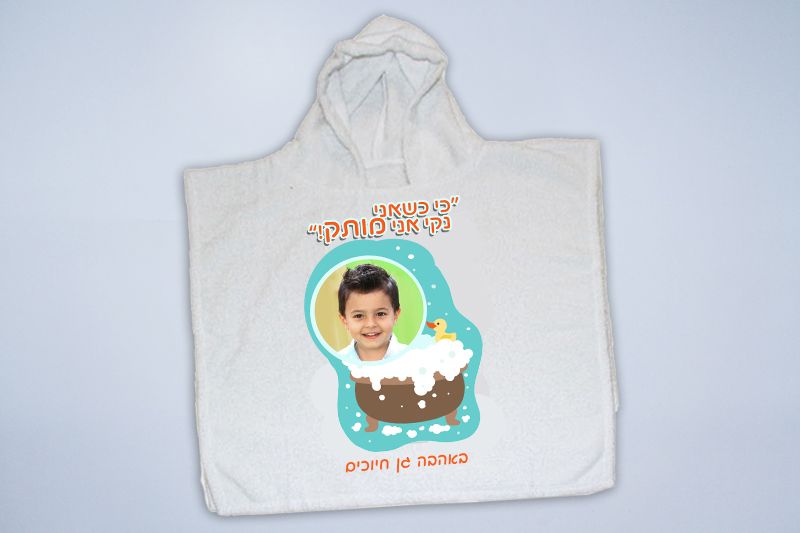 פנצ'ו – מגבת קפוצ'ון לחוף הים לבריכה או לאמבט מגבת איכותית ונעימה עם הדפסה עמידה וגרפיקה מתוקה המשלבת הקדשה ותמונה אישית
